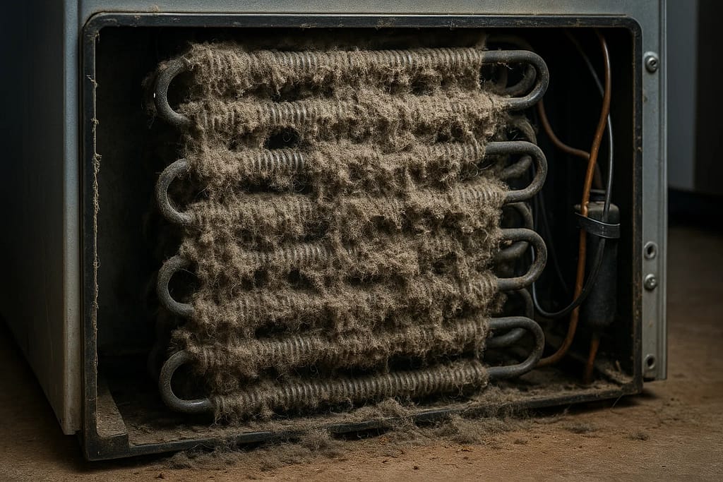 Dirty condenser coils are among the most common energy-wasting problems. When coils accumulate dust and debris, they can’t release heat efficiently, forcing the compressor to work harder and consume up to 25% more energy.