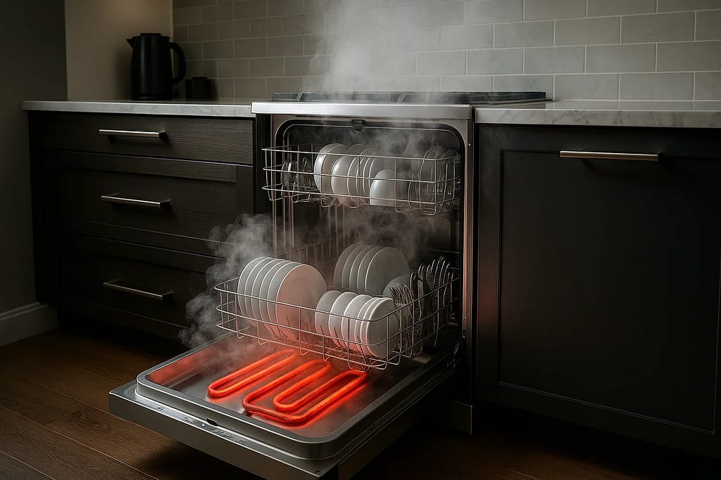 Dishwashers with faulty heating elements may run longer cycles or fail to dry dishes properly, leading to increased energy consumption and the need for additional drying cycles.