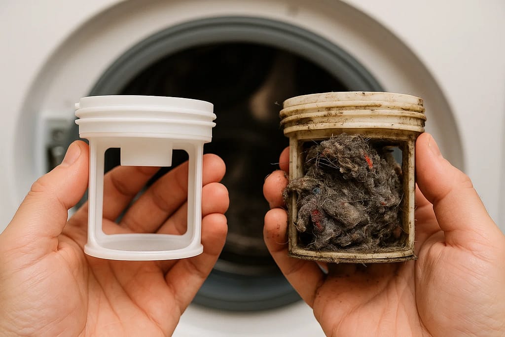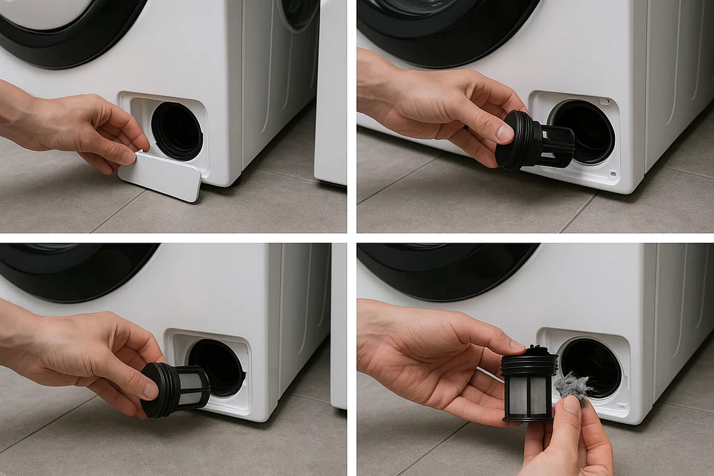 The drain pump filter catches lint, coins, and debris. When blocked, water cannot flow out properly, triggering the E2 error.